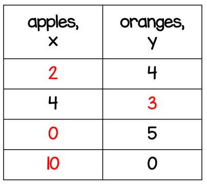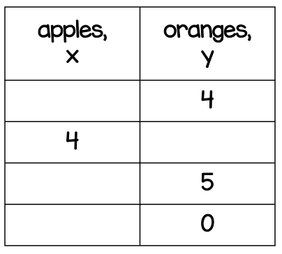 Tyler buys apples and oranges at the store. Apples cost $2 a pound and oranges cost $4 a pound. If Tyler spends $20 on apples and oranges, complete this table showing some possible combinations of each type purchased.