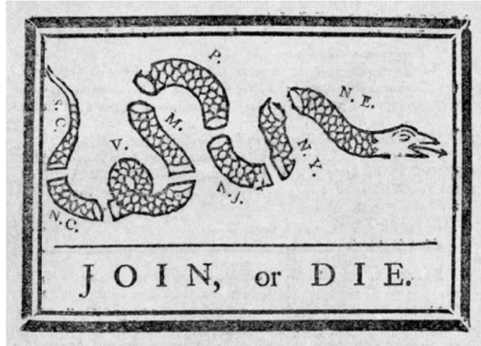 This cartoon was drawn by Benjamin Franklin in 1754.