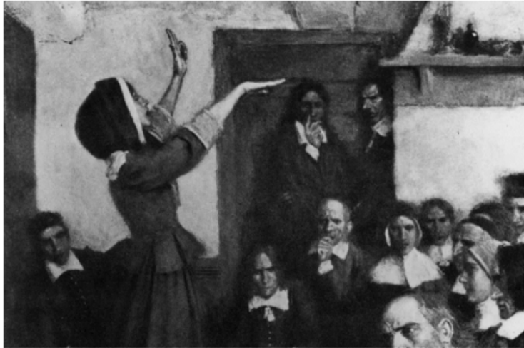 This is an image of Anne Hutchinson sharing a message in colonial Massachussets.
