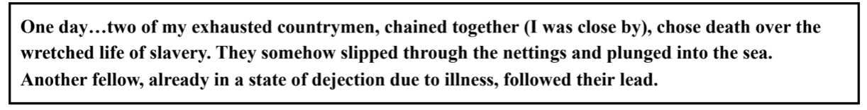 Based on this exceprt, Equiano wanted to show the horror of enslavement by focusing on which aspect of