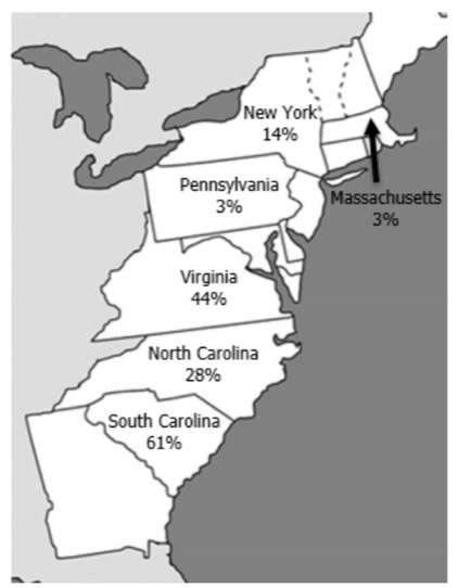 This map shows the percentage of enslaved people as part of the populations of the largest colonies in 1750.