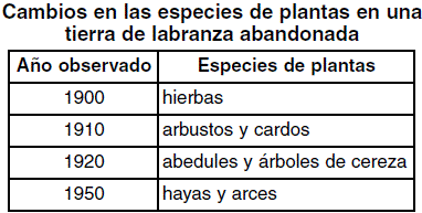 Se observó que en una tierra de labranza abandonada en 1899 se produjeron cambios importantes en las especies de plantas durante un período de 50 años. Los cambios se muestran en la siguiente tabla.