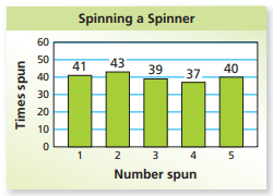 The bar graph shows the results of spinning the spinner 200 times.  What is the experimental probability of spinning a 1?