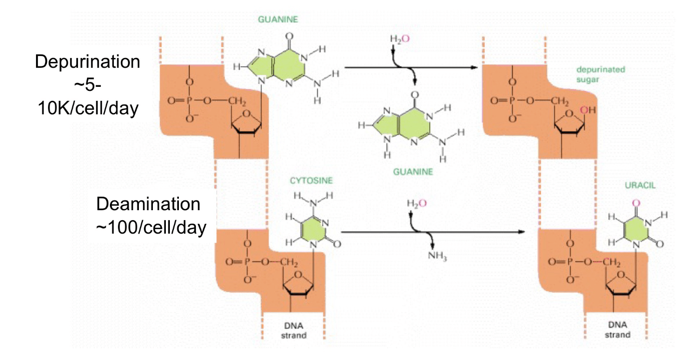 Deamination is when an amine group (NH3) is removed by mistake, and depurination is when a purine is removed (adenine/guanine)