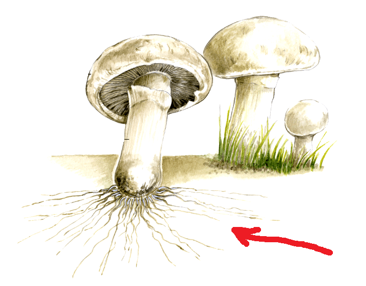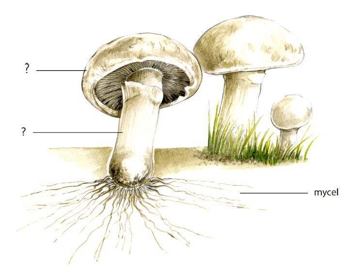 Svampens fruktkropp består av två delar (de vi kan se ovan marken och som vi äter), vad heter dessa?
