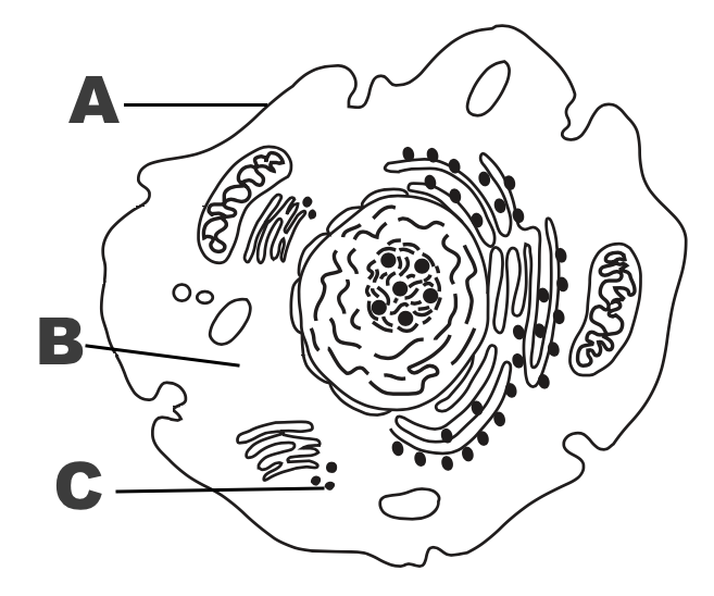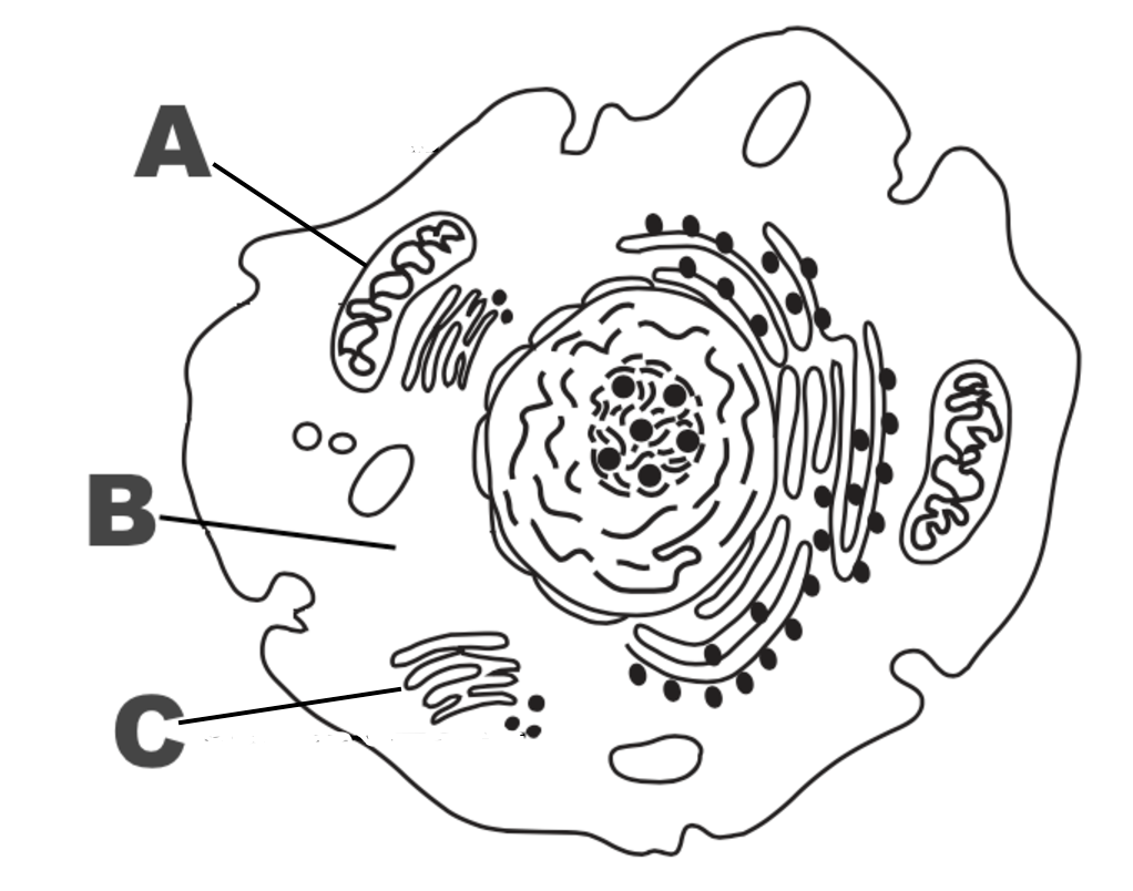Structure C represents the Golgi body, a set of flattened membrane discs that package and sort proteins.