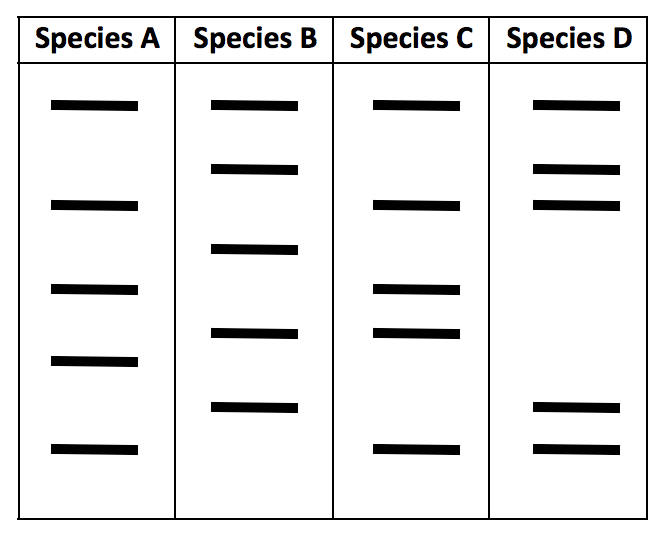 Answer: B. Species C shares the most number of bands(four bands) with species A