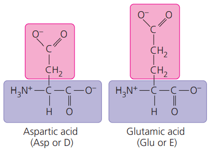 Aspartic acid and glutamic acid are acidic amino acids. In cellular pH (7.2), they have
