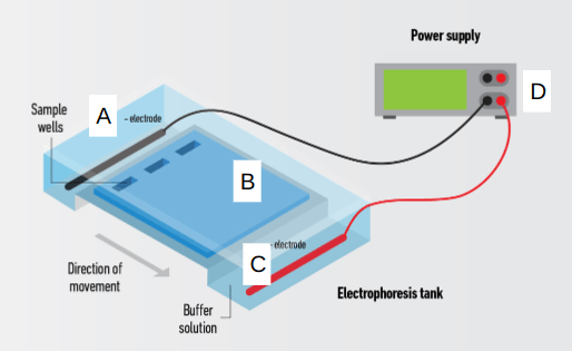 The picture below shows an apparatus used for DNA agarose gel electrophoresis. Which letter indicates the anode on the apparatus?