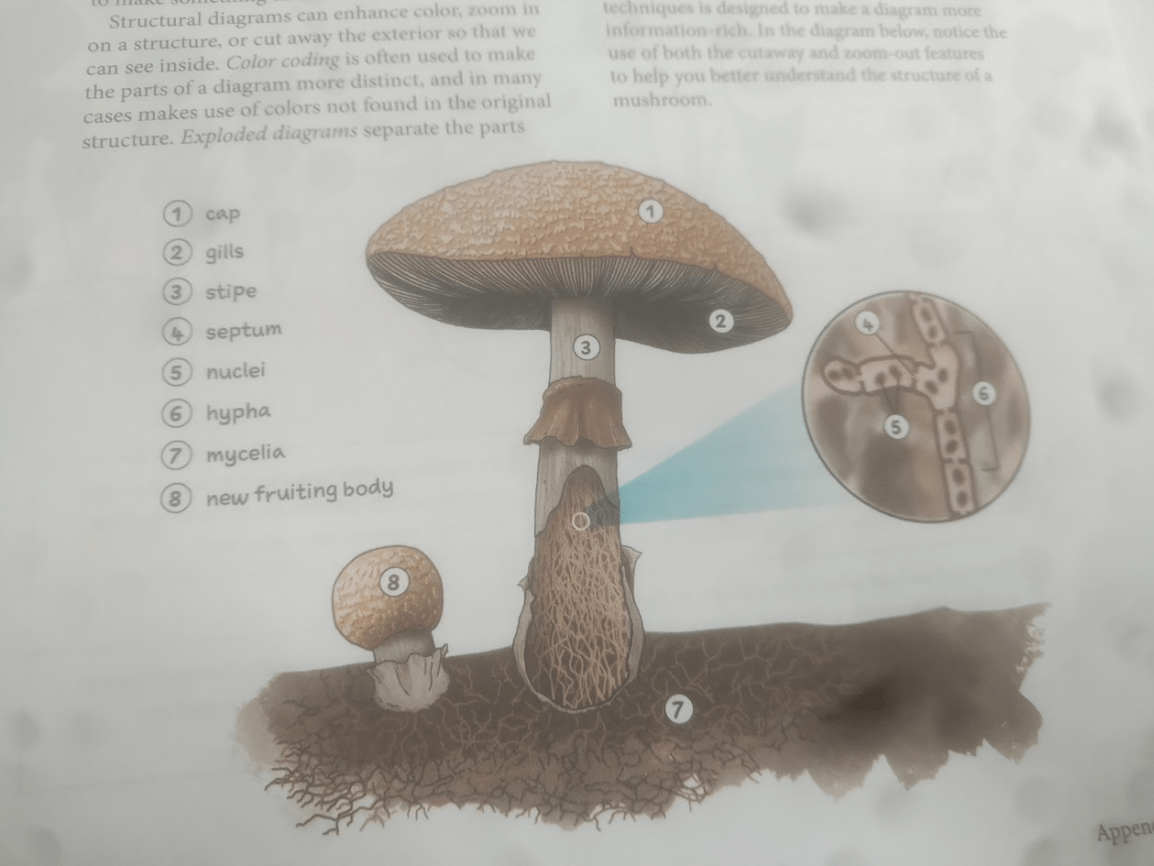 hyphae, mycelia, fruiting body, stipe, cap, and gills