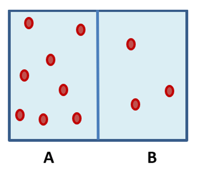 Towards side A because water moves from high water concentration to low water concentration meaning it goes towards an area with higher solutes