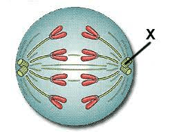 Label what organelle the x is pointing to the pink organelles, and the long yellow strands