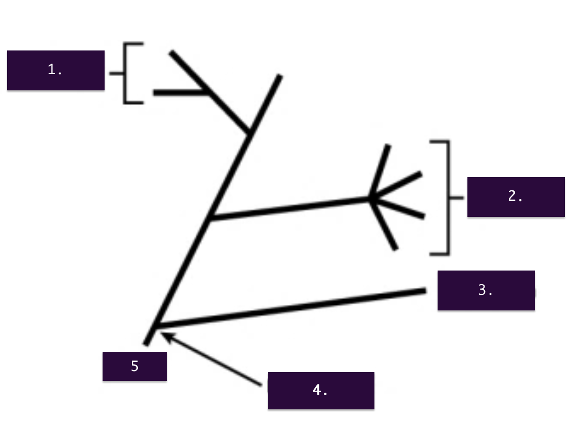 word bank: branch point, polytomy, basal taxon, sister taxa, root