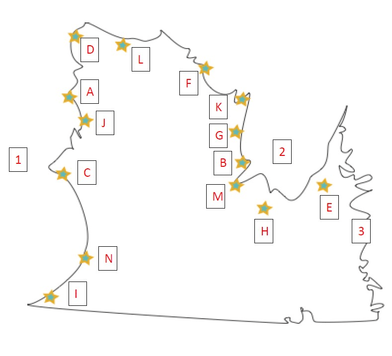 Name the village indicated by the letter J on the map.