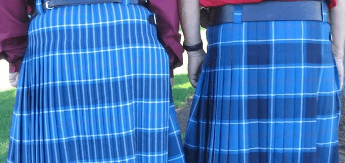 These are the two traditional styles that can be used when folding the pleats in a kilt —either matching the full tartan pattern or emphasizing a single vertical line.