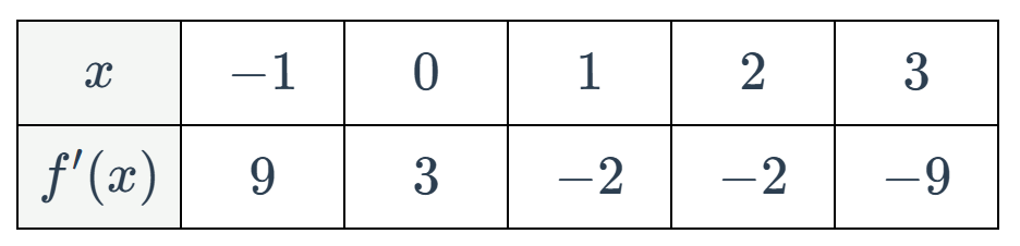 Let f(x) be a function satisfying  f(-1)=1. Selected values of the derivative of f(x) are given in the table below: