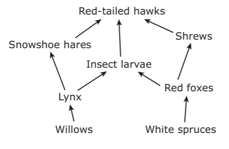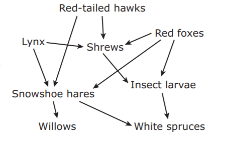 In this food web, shrews, insect larvae, and snowshoe hares are all competitors for red-tailed hawks. True or false?