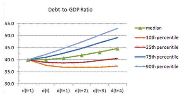 Pour le graphique en éventail ci-dessous, quelle est la probabilité que le ratio dette/PIB reste supérieur à 40 % du PIB en période d(t+3) ?