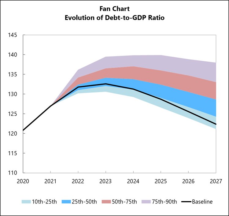 d. La probabilité que le ratio dette/PIB reste inférieur à 128 % d’ici 2027 est d’environ 50%