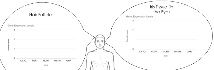 Should the gene expression of various genes in the hair and eyes be the same or different?