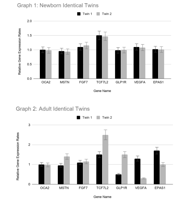 Comparing the differences in gene expression of specific genes for two identical twins as newborns and adults.