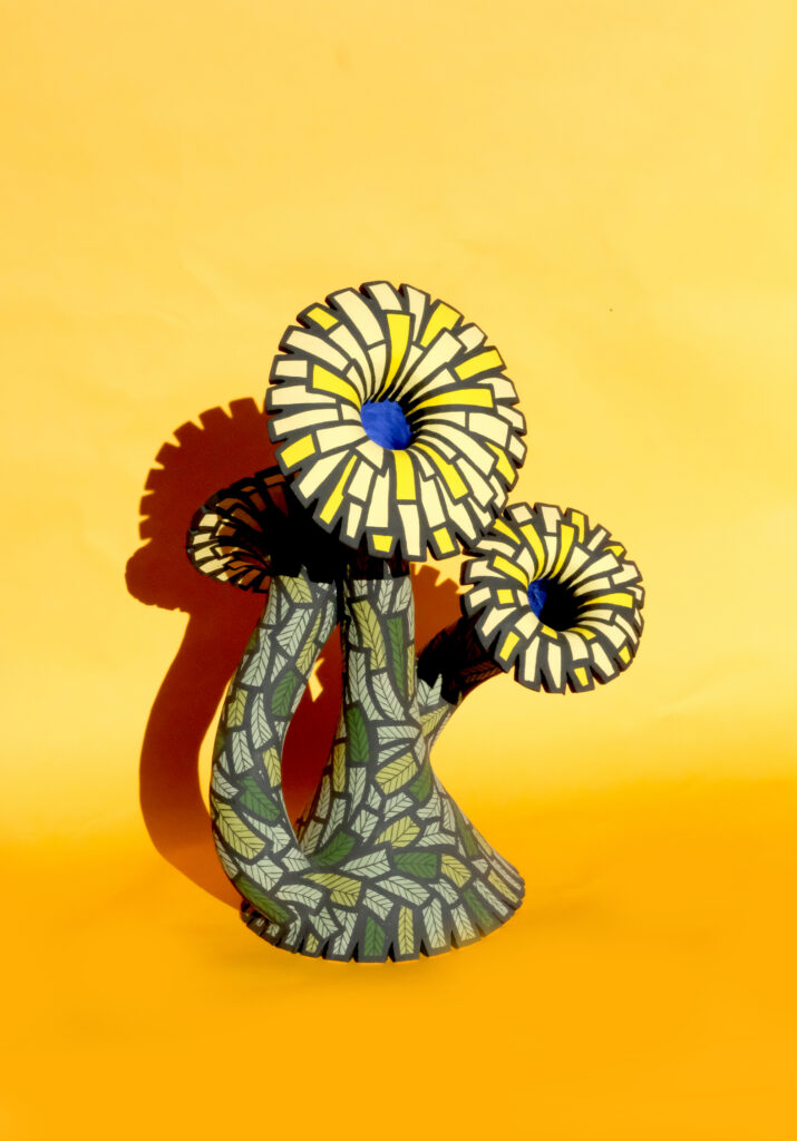 What part of the critique process is this: The artwork below shows a vase with three mock stems with flowers growing out of it. The vase has leaves on it and the flower is yellow with glazed petals. The center of the flowers is blue.