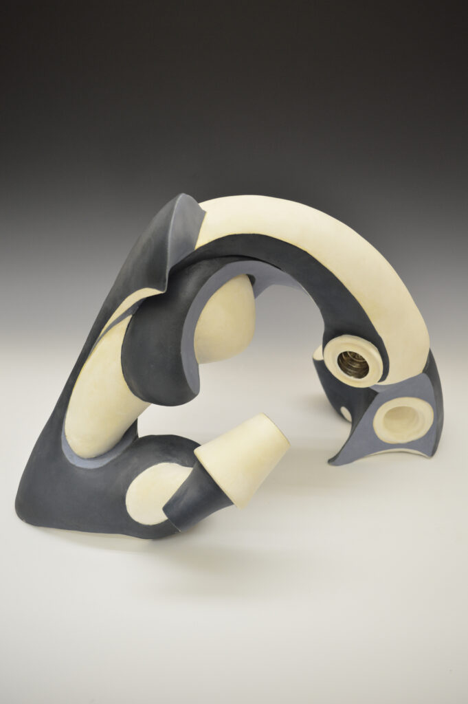 What part of the critique process is this: The artwork below shows a ceramic form that is laying in an upside down u. It has high contrast with black and white colors creating organic shapes on the body of the piece. The balance in the artwork is asymmetrical as it is different from one side to the other. The movement of your eye through the piece can be described as travelling from the left to the right following the dark shapes and bubbling in and out with the variety in the form.