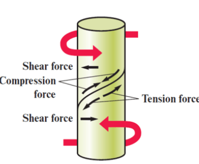Loads caused by twisting in opposite directions from the opposite ends of a structure cause shear stress over the entire cross section of that structure.