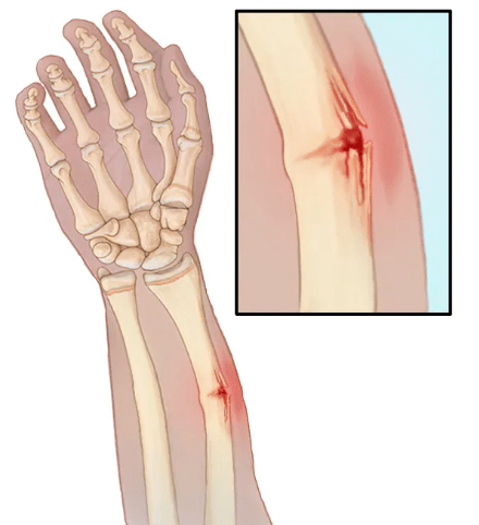 Fracture that is an incomplete break in a bone that has not completely ossified (Elementary - Middle School aged athletes).
