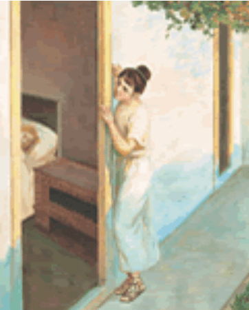 Cornēlia cubiculum Flāviae fūrtim intrat quod Flāviam surgere nōn vult.