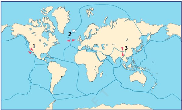 What are the type of plate boundaries shown at 1, 2, and 3?
