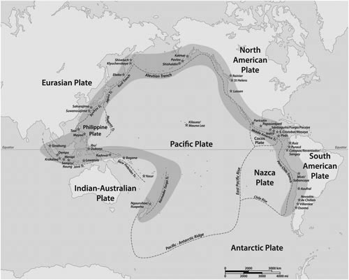 The map shows the location of “The Ring of Fire.” This area accounts for 75% of active and dormant volcanoes on Earth.