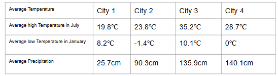 Based of the chart information of four cities, which city is most likely an in-land city located in the northern region of the U.S.?