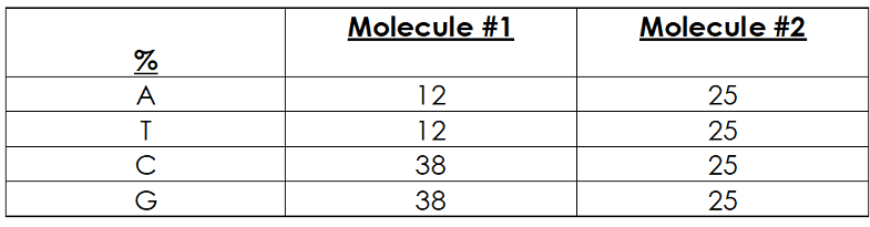 Based on the comparison is base composition, the DNA molecule with the higher Tm (melting temperature) would be this one: