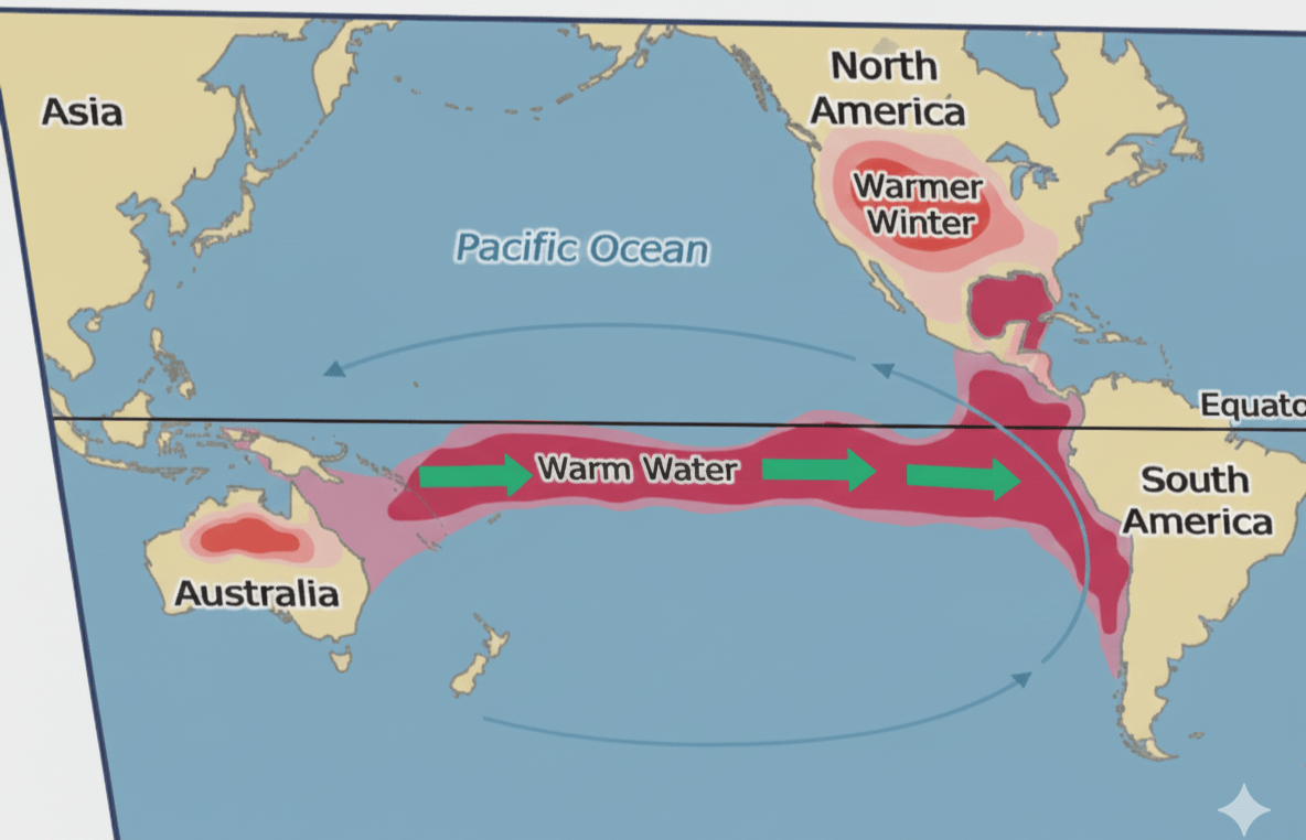 What climate effect is noted over North America during El Niño winters (from the provided map notes)?