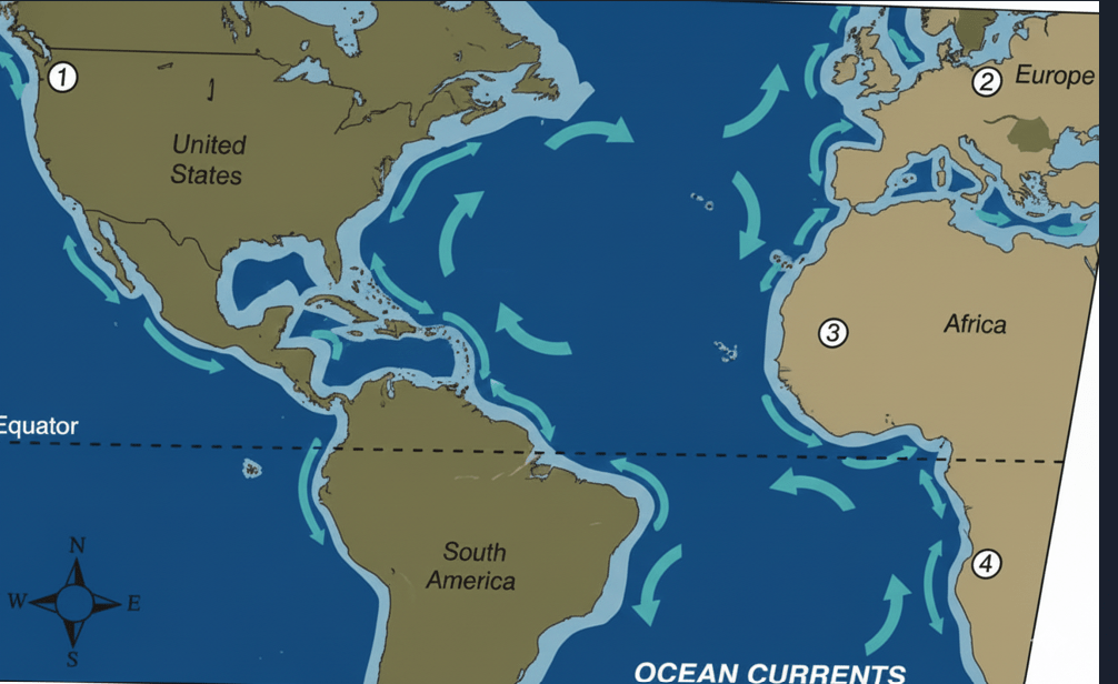 On the map of ocean gyres, which numbered location (1, 2, 3, or 4) is MOST likely to have a warmer climate than expected because of a warm current?