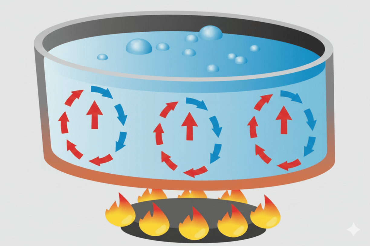 In the convection diagram of a heated pot, does warm water rise or sink?