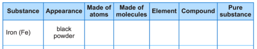 Bill has iron flakes, salt and water.  He makes a table to describe the different substances he has. Which boxes should he check for Iron (Fe)?