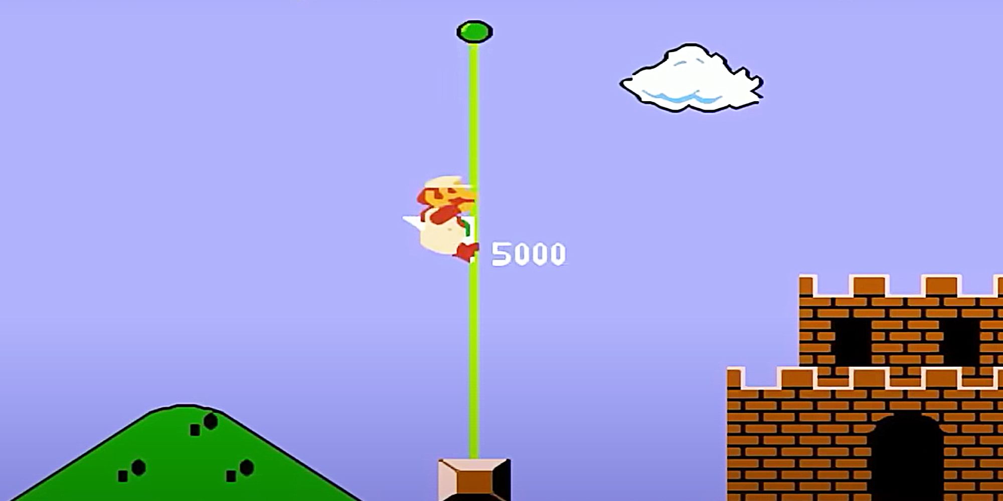 What object does Mario typically leap onto after completing a level in the earliest iterations of his franchise?