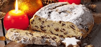 A dry cake shaped like a loaf of bread filled with marzipan and raisins and covered with powdered sugar. What country does it come from?