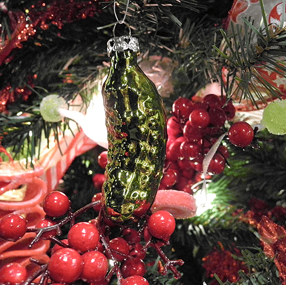 This decoration should be your favorite Christmas decoration because they mean that you get an extra present: in many countries, an ornament in the shape of this vegetable is hidden somewhere in the Christmas tree and the person who finds it, will get an extra present or just a whole lot of good fortune. Name the ornament.