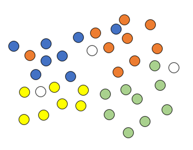 Empleando el algoritmo de 3-Vecinos Cercanos, indica de qué colores tendrían que pintarse los círculos blancos.