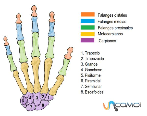 Trapecio, trapezoide, grande, ganchoso, pisiforme, piramidal, semilunar, escafoides.
