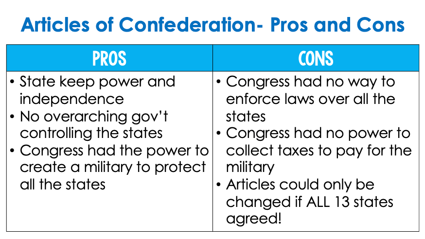 Identify one "pro" and one "con" of the Articles of Confederation.