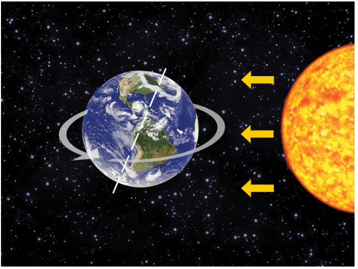 Another way to say “Earth spins on its axis, which causes day and night” is Earth ________, which causes day and night.