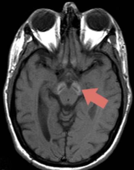 A 47-year-old man presents to the emergency room in an acute state of disorientation, with tachycardia, ophthalmoparesis, diaphoresis, and ataxia. He dies in the hospital 48hours later. Brain autopsy of this patient would reveal: