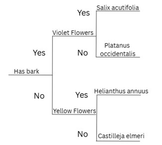 The simple dichotomous key shown below is used to identify different plants.