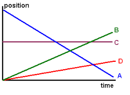 Notice that A starts a far distance away and ends near the reference location. This occurs in the same amount of time that B and D start at the reference location and travel some smaller distance. B is going faster than D.