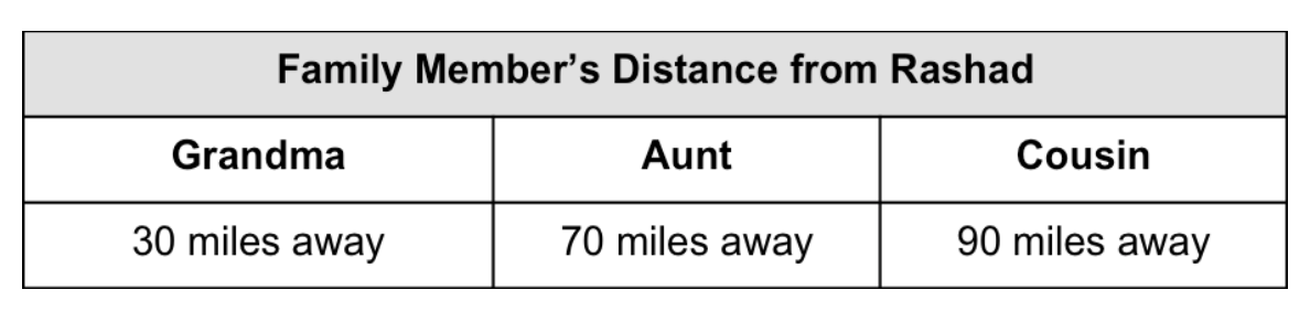 Rashad communicates with some of his family members by writing letters. The table below tells how far away his family members live.