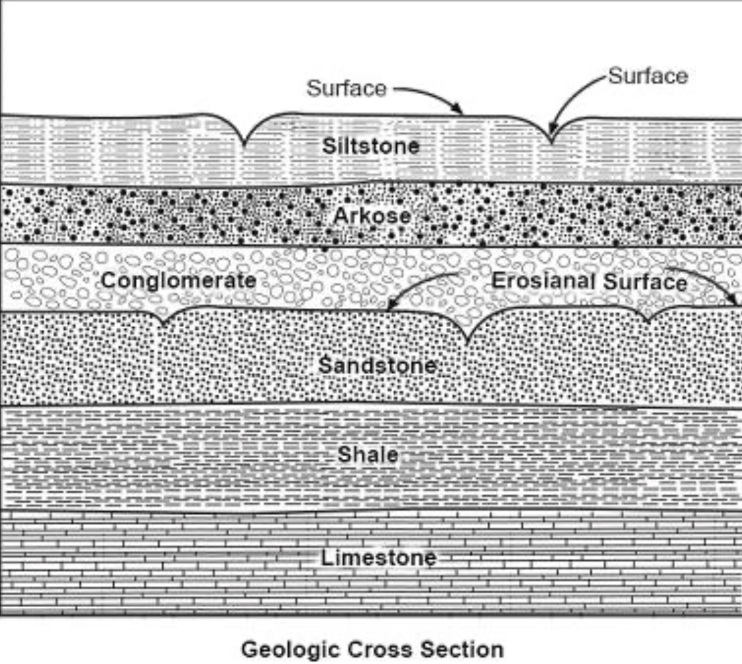 This image shows different layers of rock under the surface. Based on the law of superposition, what is the name of the layer of rock that is the oldest?